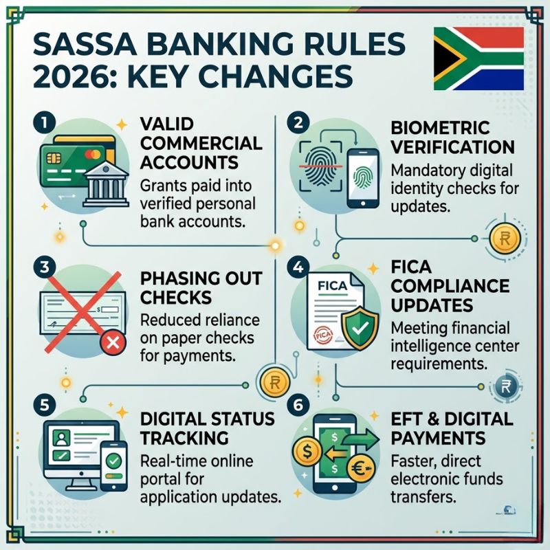 Stronger identity authentication techniques and banking verification processes are mandated by the new SASSA regulations. Beneficiaries must authenticate themselves using biometric techniques and use the SASSA system to confirm their bank details. By preventing duplicate applications and payments from going to the incorrect accounts, the system stops fraudulent claims. In order to ensure they continue to receive payments, recipients should update their personal information via official SASSA channels.